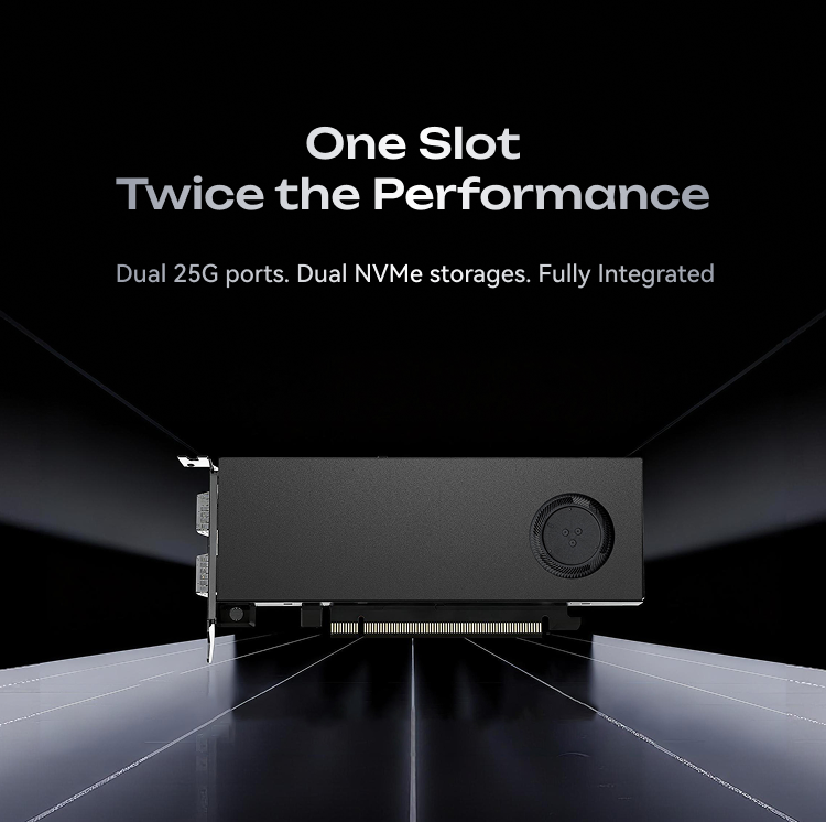 - Installé dans un emplacement x16 bifurqué : peut être configuré dans le BIOS en « X8 X4 X4 » ou « X4 X4 X4×4 » pour prendre en charge à la fois les deux ports réseau 25 Gbit/s et deux SSD.