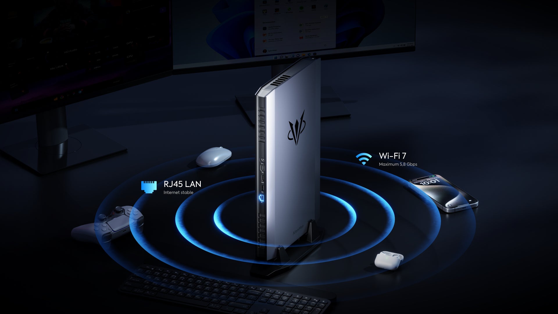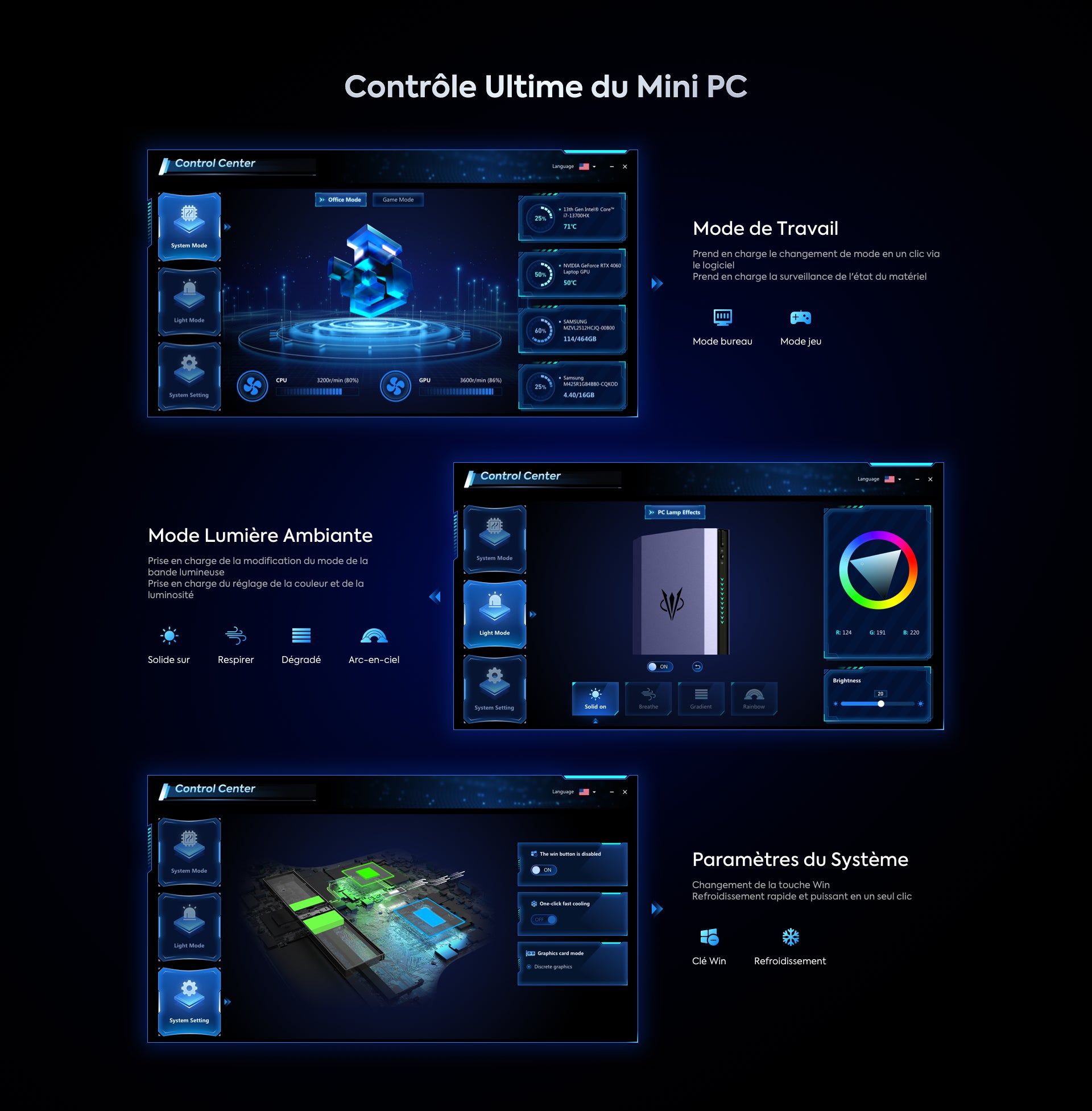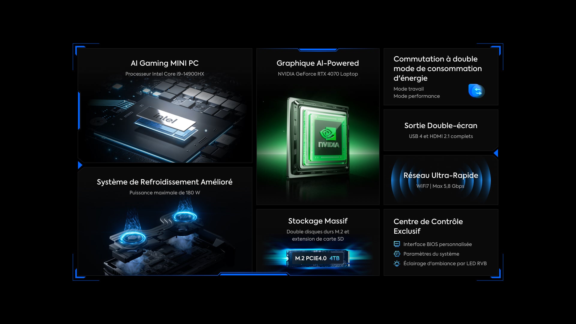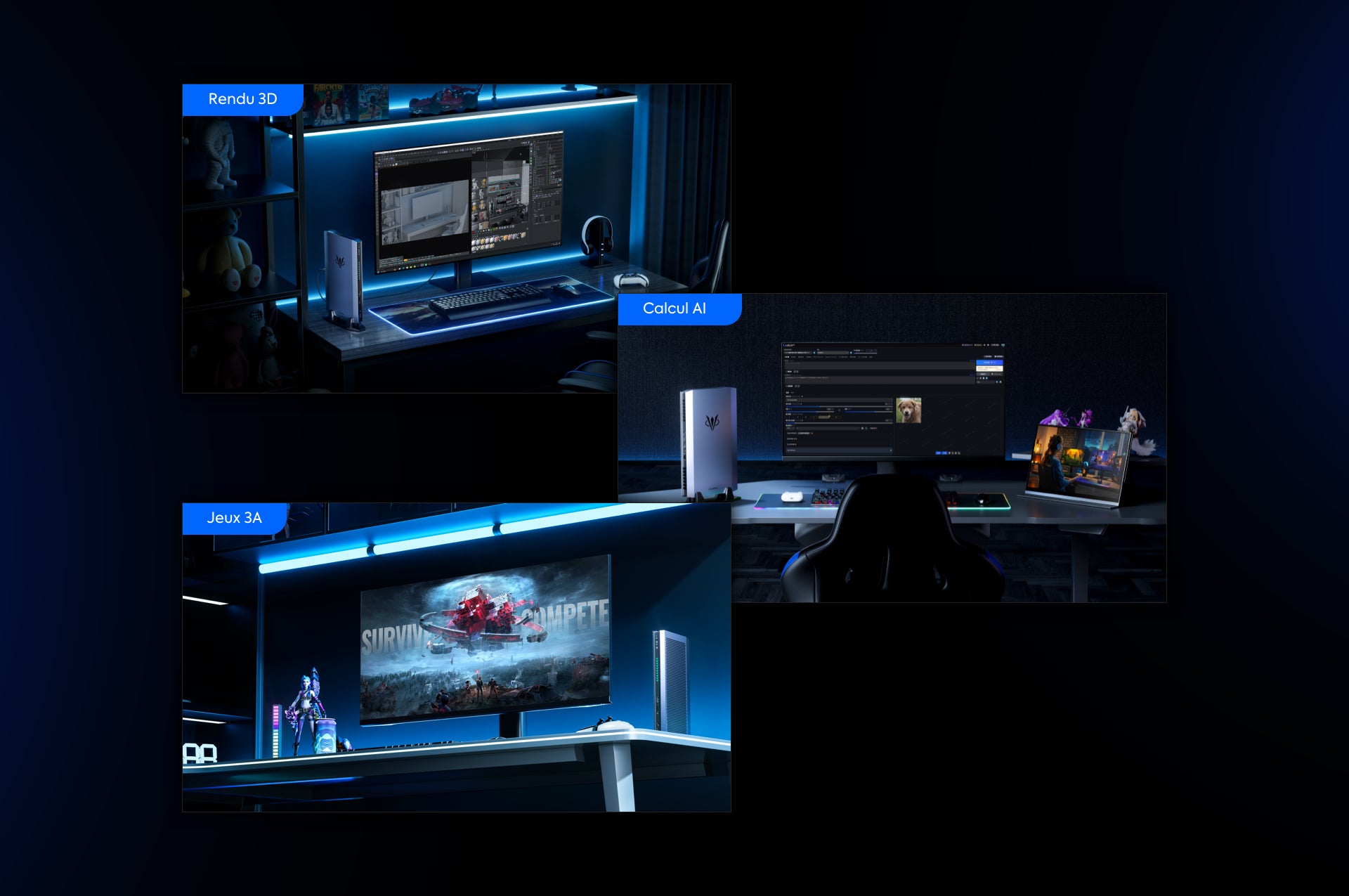 Un mini PC haut de gamme conçu pour les joueurs et les créateurs passionnés, capable de prendre en charge les jeux AAA, le rendu vidéo, la conception 3D et les projets Al.