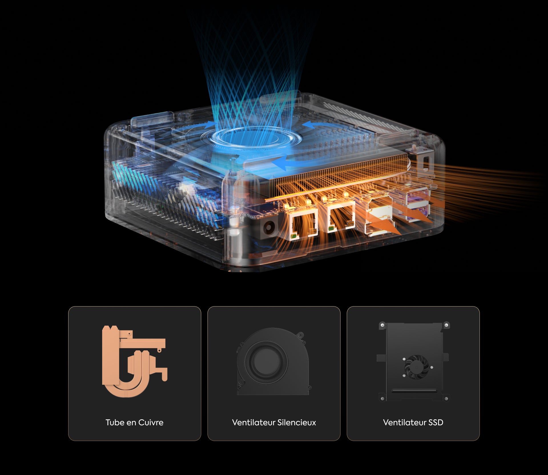 EliteMini Al370 est doté d'un grand ventilateur silencieux et de trois caloducs en cuivre pour garantir que votre appareil reste froid et silencieux pendant que vous travaillez ou jouez.