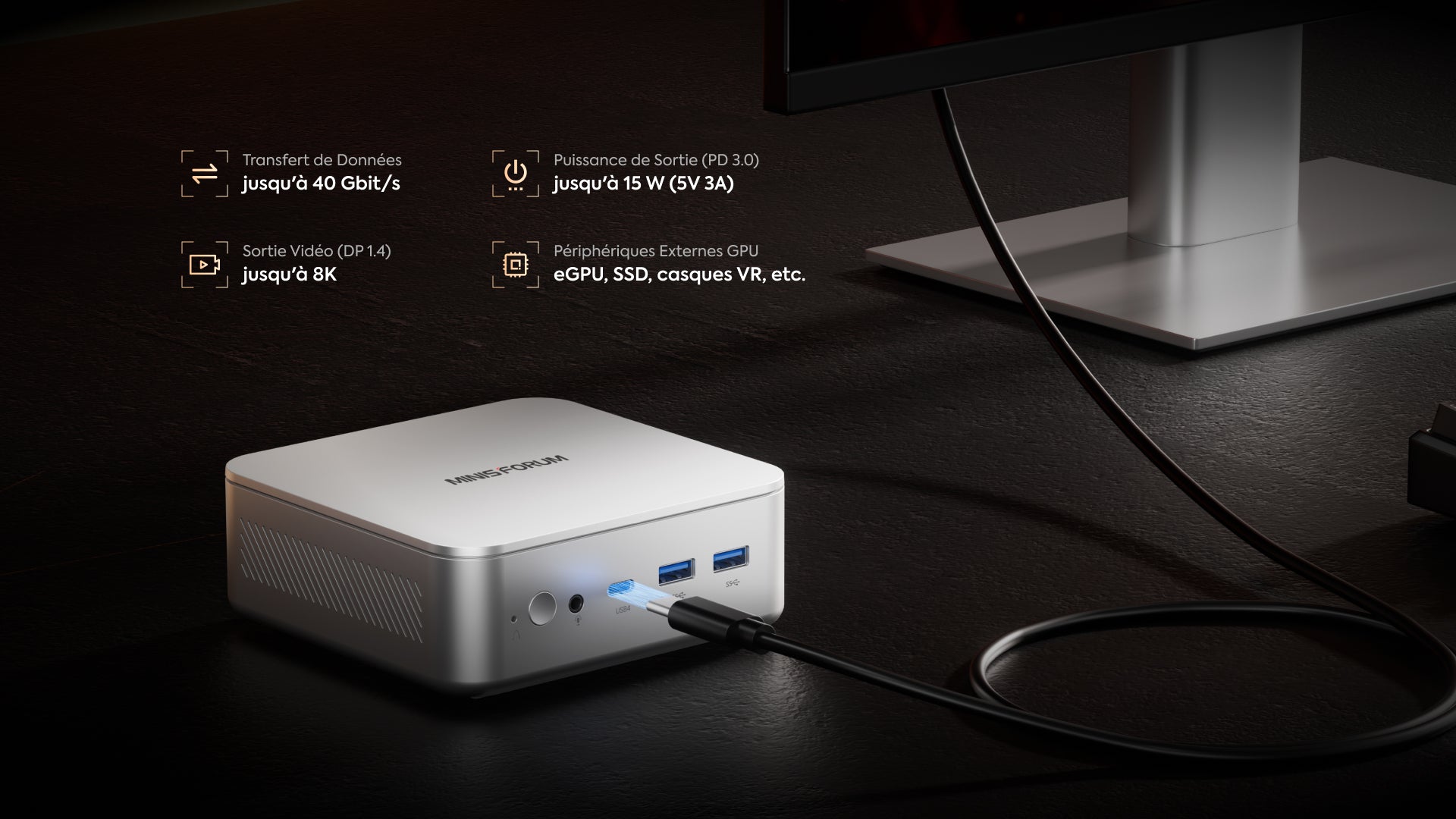 EliteMini Al370 permet une utilisation multitâche transparente grâce à son port USB4 haute vitesse, ses connexions HDM2 et DP 2.0. Connectez sans effort jusqu'à trois écrans 4K pour dynamiser votre flux de travail et améliorer votre efficacité.