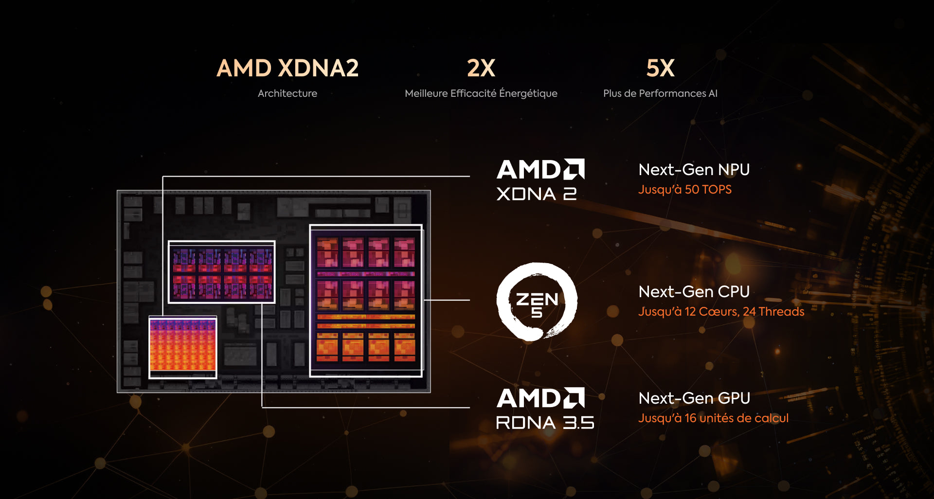 Le nouveau processeur Ryzen Al est doté de la NPU la plus avancée au monde, avec une performance de 50 Al TOPS, offrant une efficacité axée sur l'Al. Construit sur l'architecture AMD XDNA2, il offre une efficacité énergétique deux fois supérieure et des performances Al cinq fois plus élevées, établissant ainsi un nouveau standard pour l'informatique intelligente.