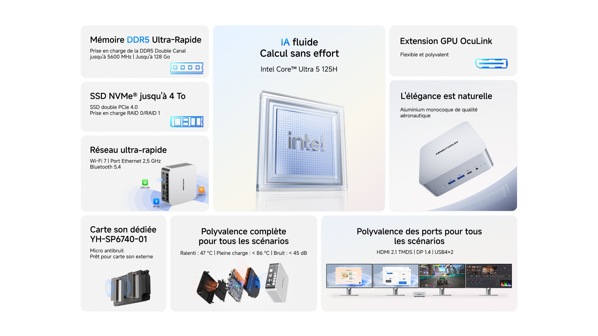 Doté d'une carte son indépendante et compatible USB, il offre une qualité sonore exceptionnelle. La sortie quadruple écran et le Wi-Fi 7 + Ethernet 2,5 GHz garantissent un streaming et un contrôle fluides et de haute qualité.