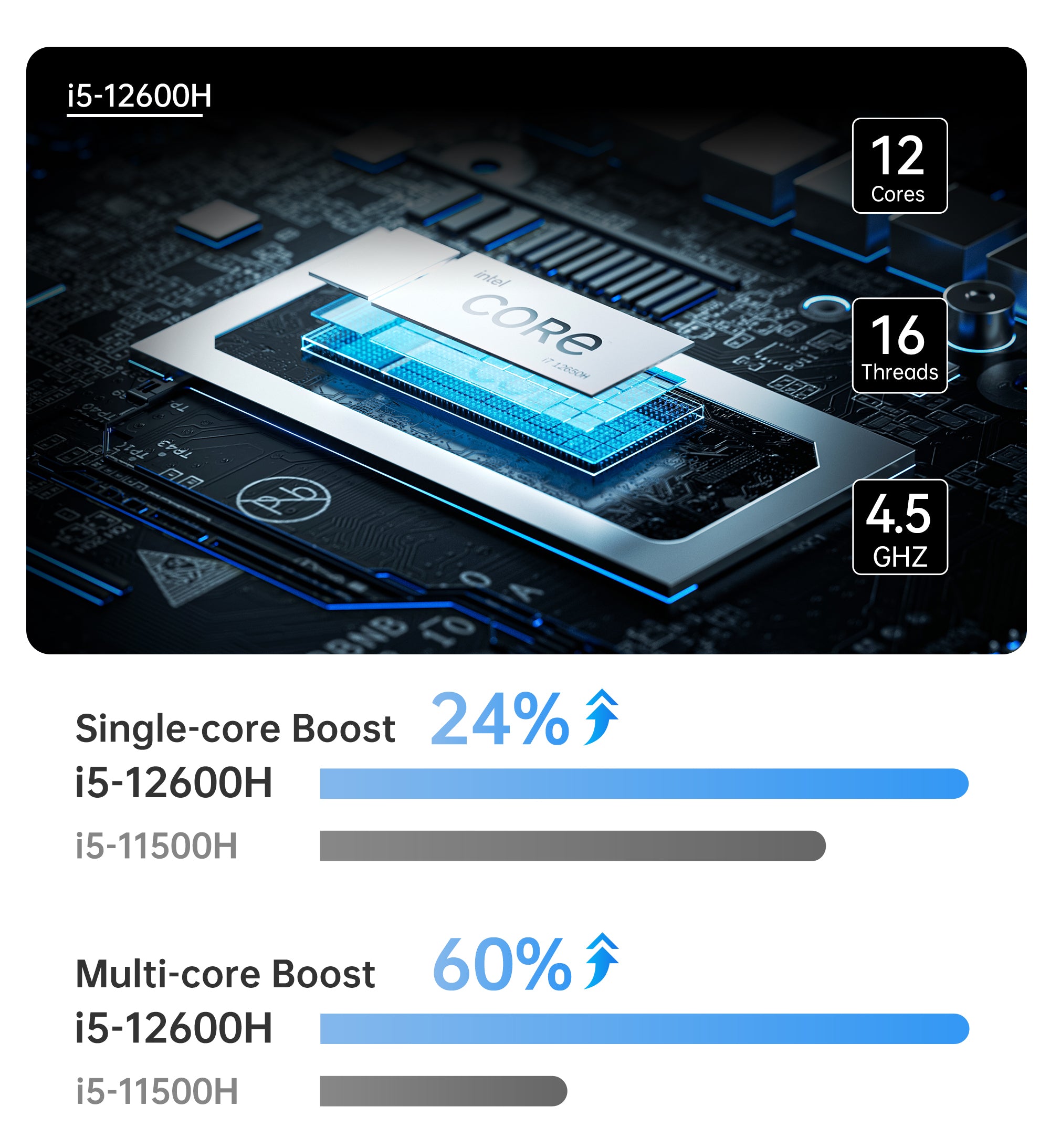 Série Venus NAB6 Lite est équipé du processeur Intel Core™ i5-12600H. Ce CPU a 12 cores / 16 threads et une fréquence de 4,5 GHz. Avec 2 ports Ethernet, il peut être connecté directement à l'écran et supporter une alimentation PD de 100W, ce qui évite d'avoir plusieurs câbles.