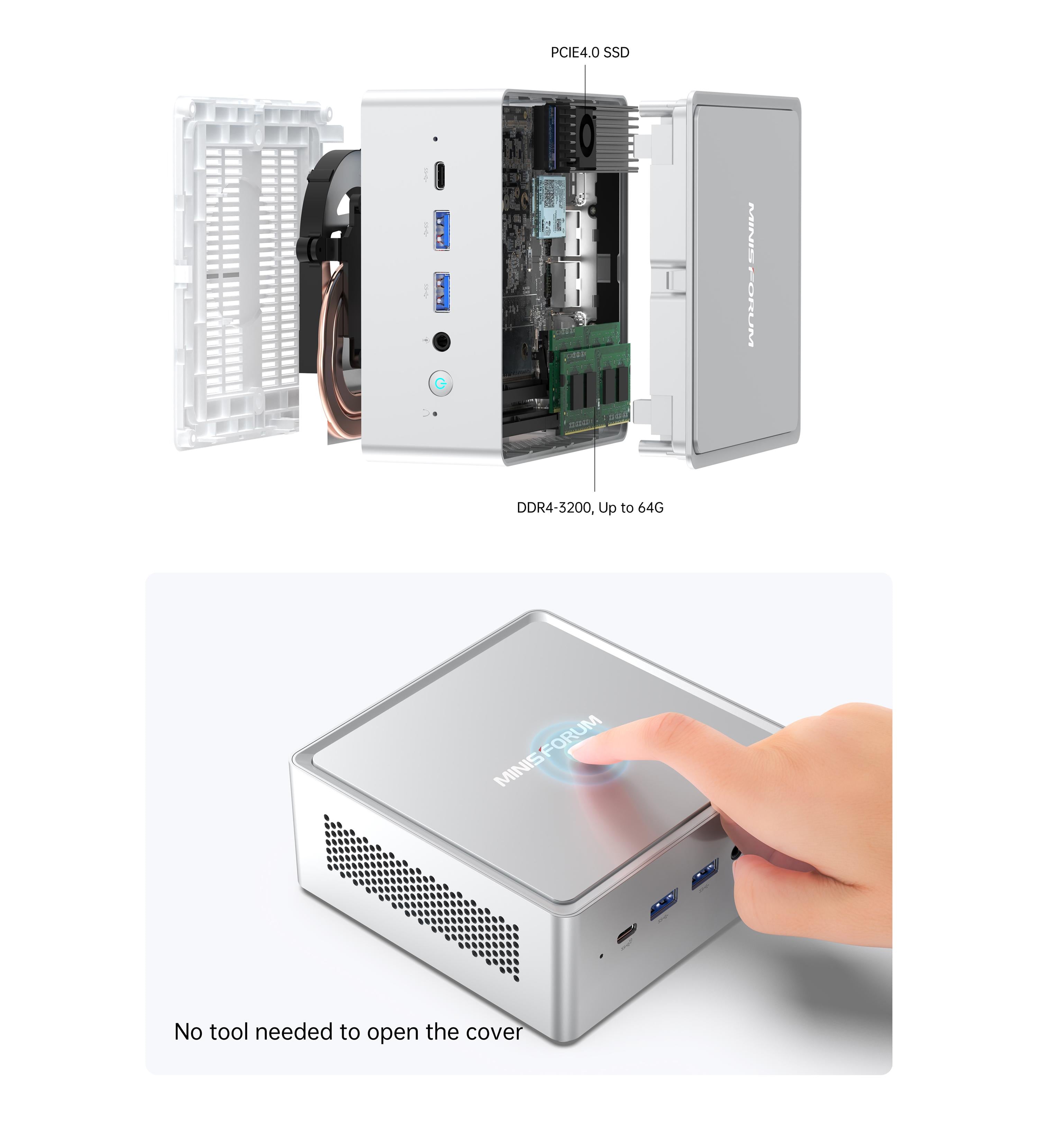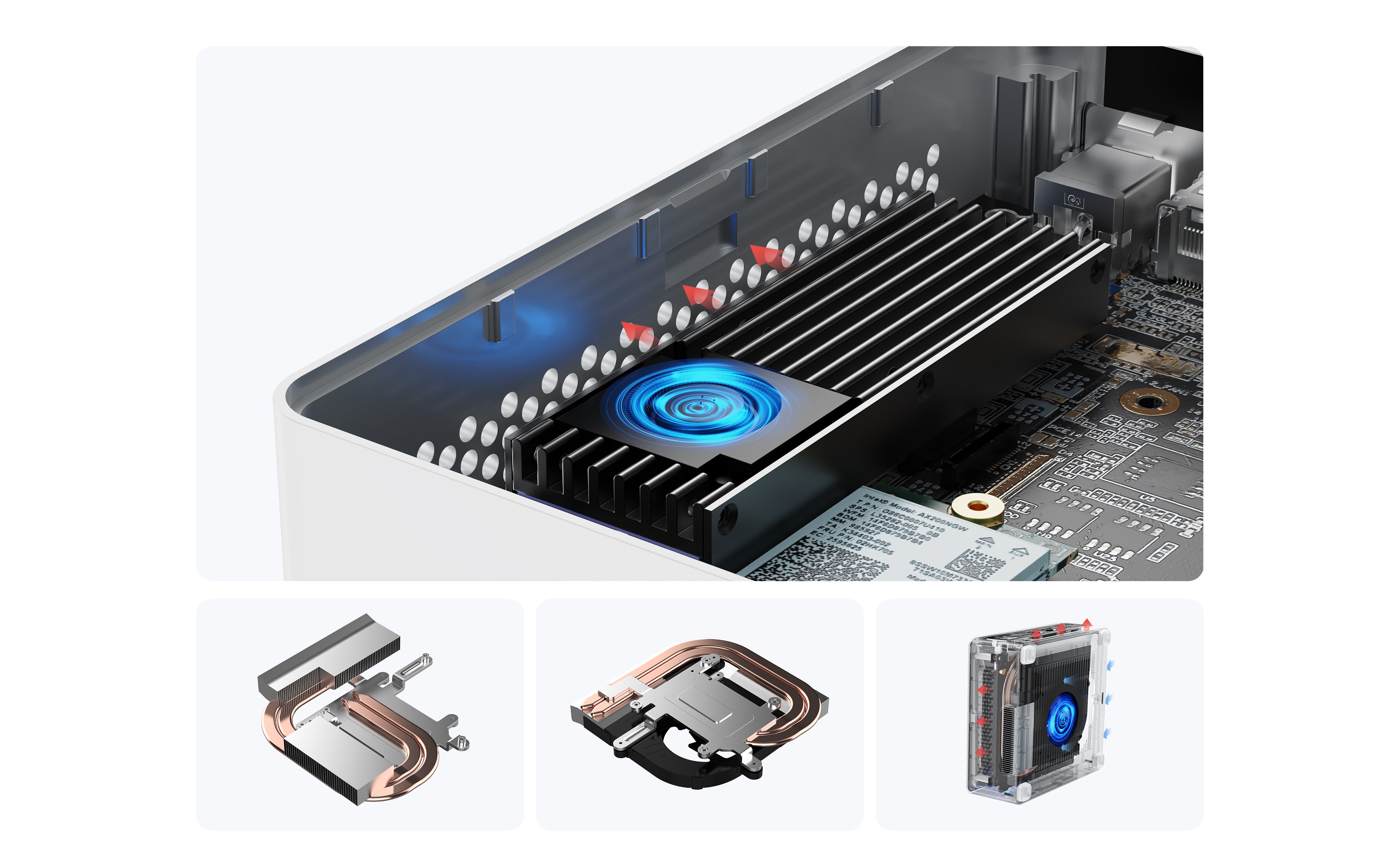 Minisforum a spécialement développé un nouveau refroidisseur actif Solid-State avec des ouvertures de refroidissement latérales afin de résoudre complètement le problème de l'accumulation de chaleur sur les disques durs de stockage. Double caloducs intégrés et doubles ouvertures d'aération pour un refroidissement efficace.
