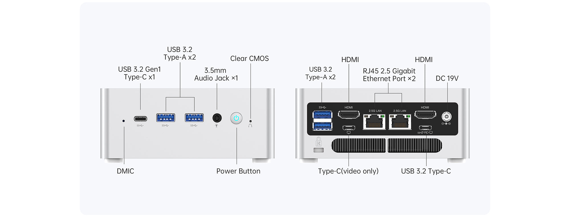 NAB6 Lite dispose de 4 connecteurs de type-A, 3 connecteurs de type-C pour répondre à différents besoins. En outre, il dispose de HDMI (4K@60Hz) x 2, USB Type-C (4K@60Hz) x 2, pour supporter jusqu'à 4 écrans en même temps.