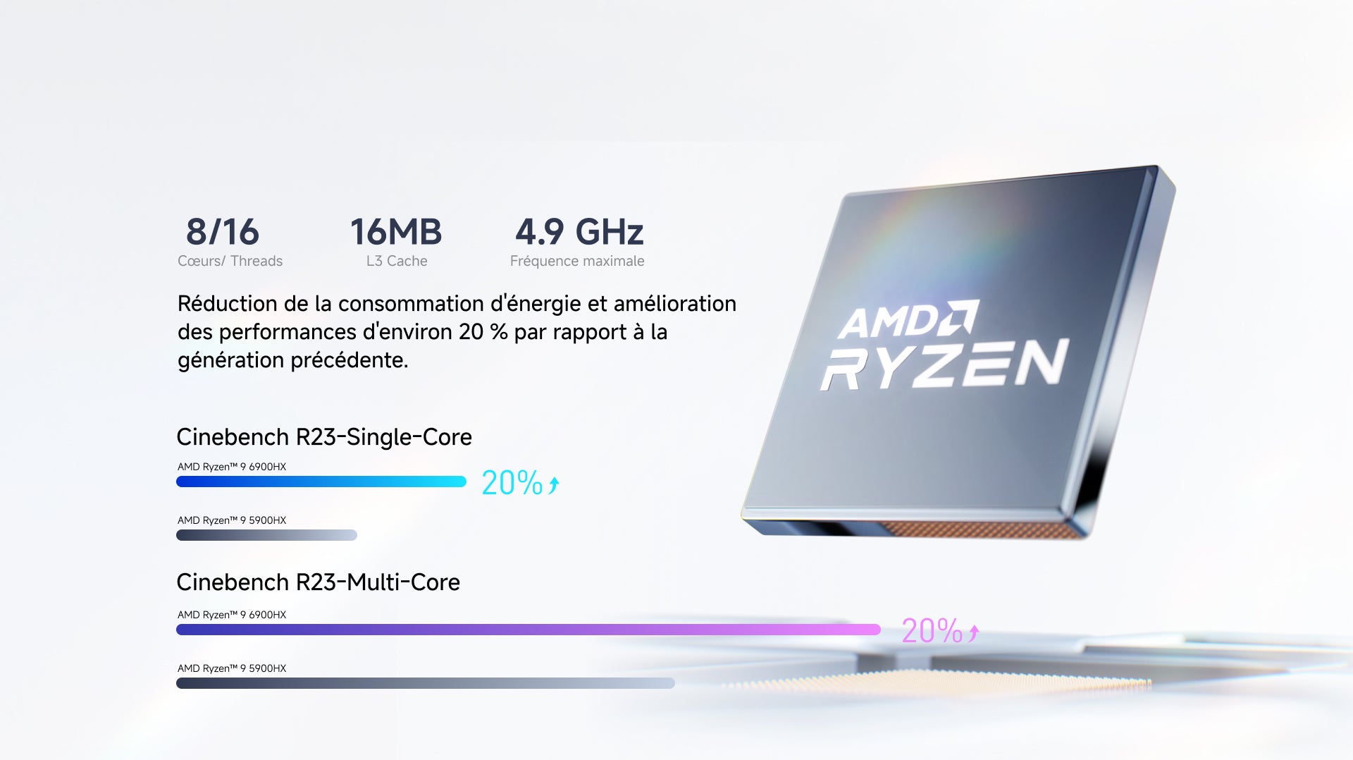 AMD Ryzen™ 9 6900HX, 8C/16T, Fréquence Turbo maximale 4,9 GHz, TDP 65W.