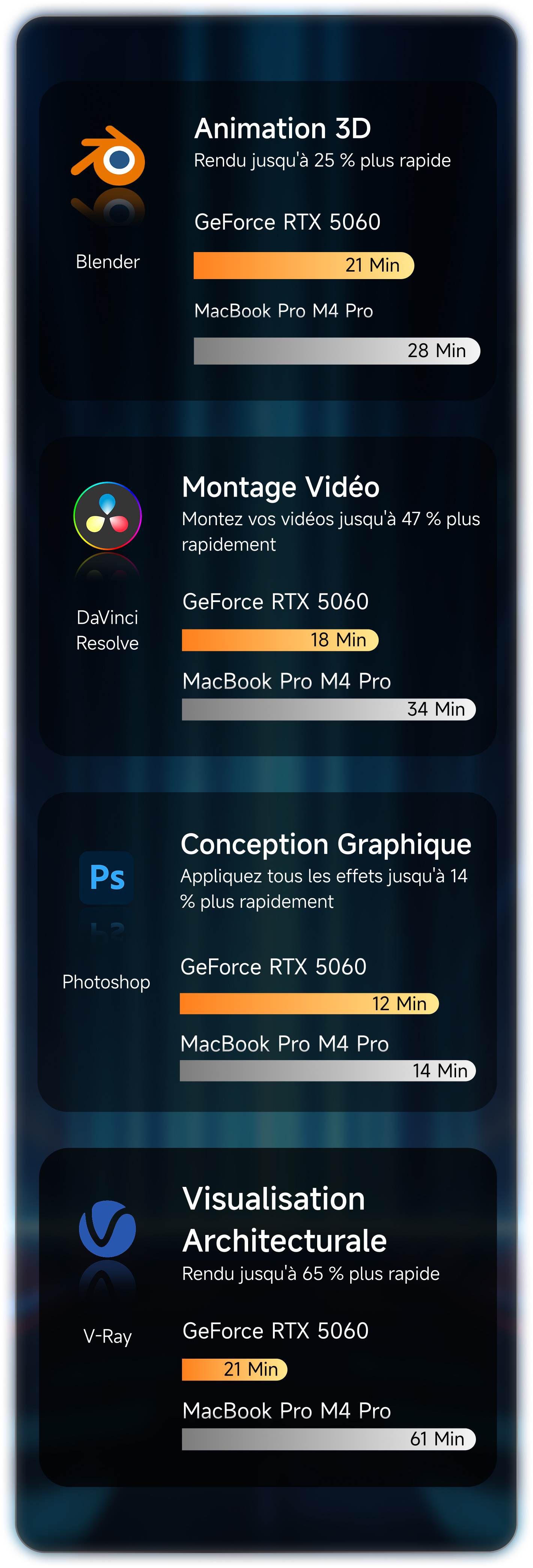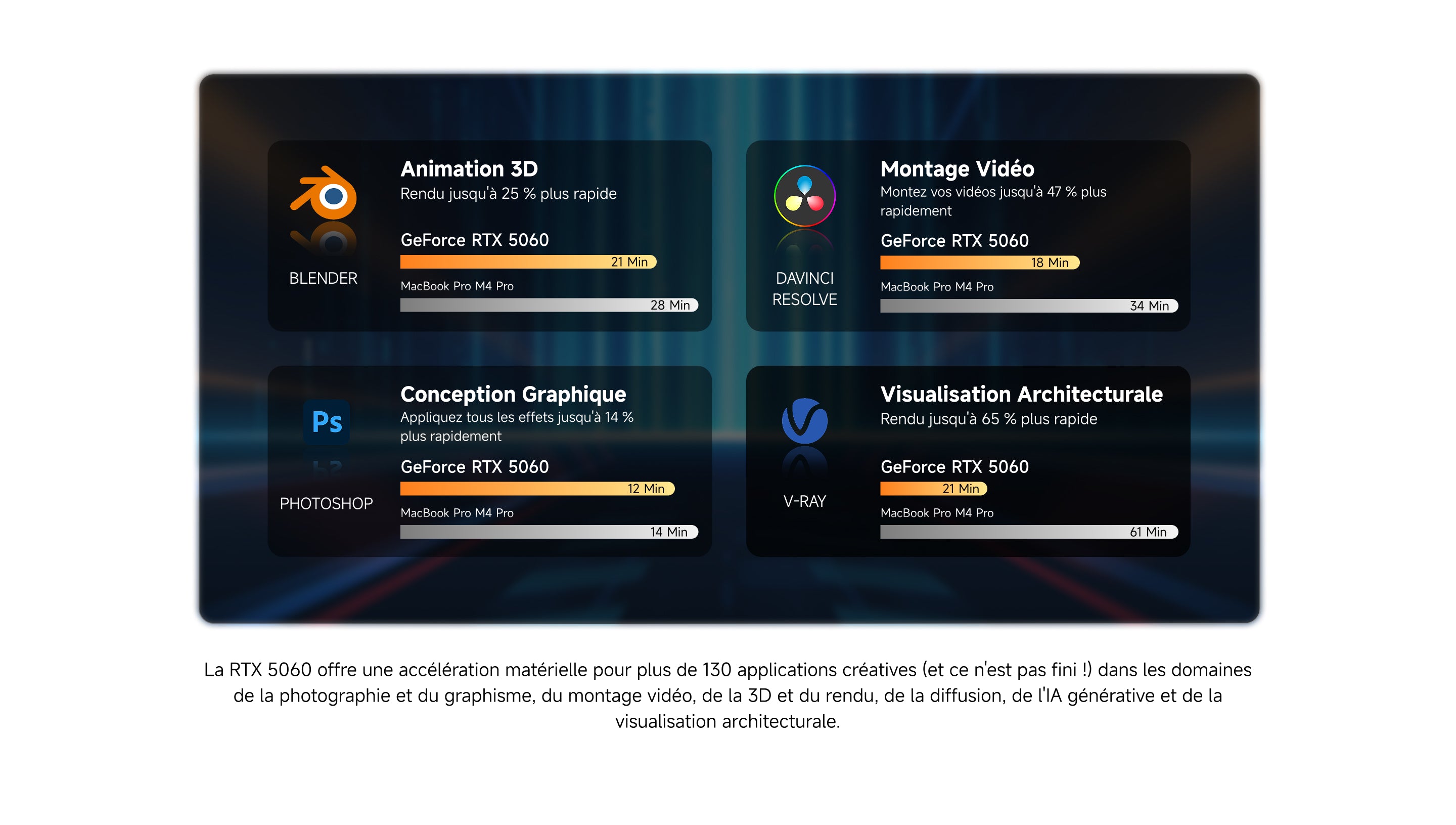 La RTX 5060 offre des performances exceptionnelles pour la création assistée par l'IA. Avec NVIDIA Studio, elle accélère une large gamme de logiciels créatifs.