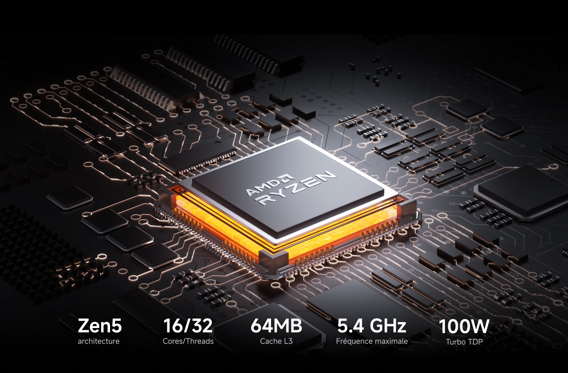 (Zen 4, 16 cœurs, 32 threads, 64 Mo de cache L3, jusqu'à 5,4 GHz)