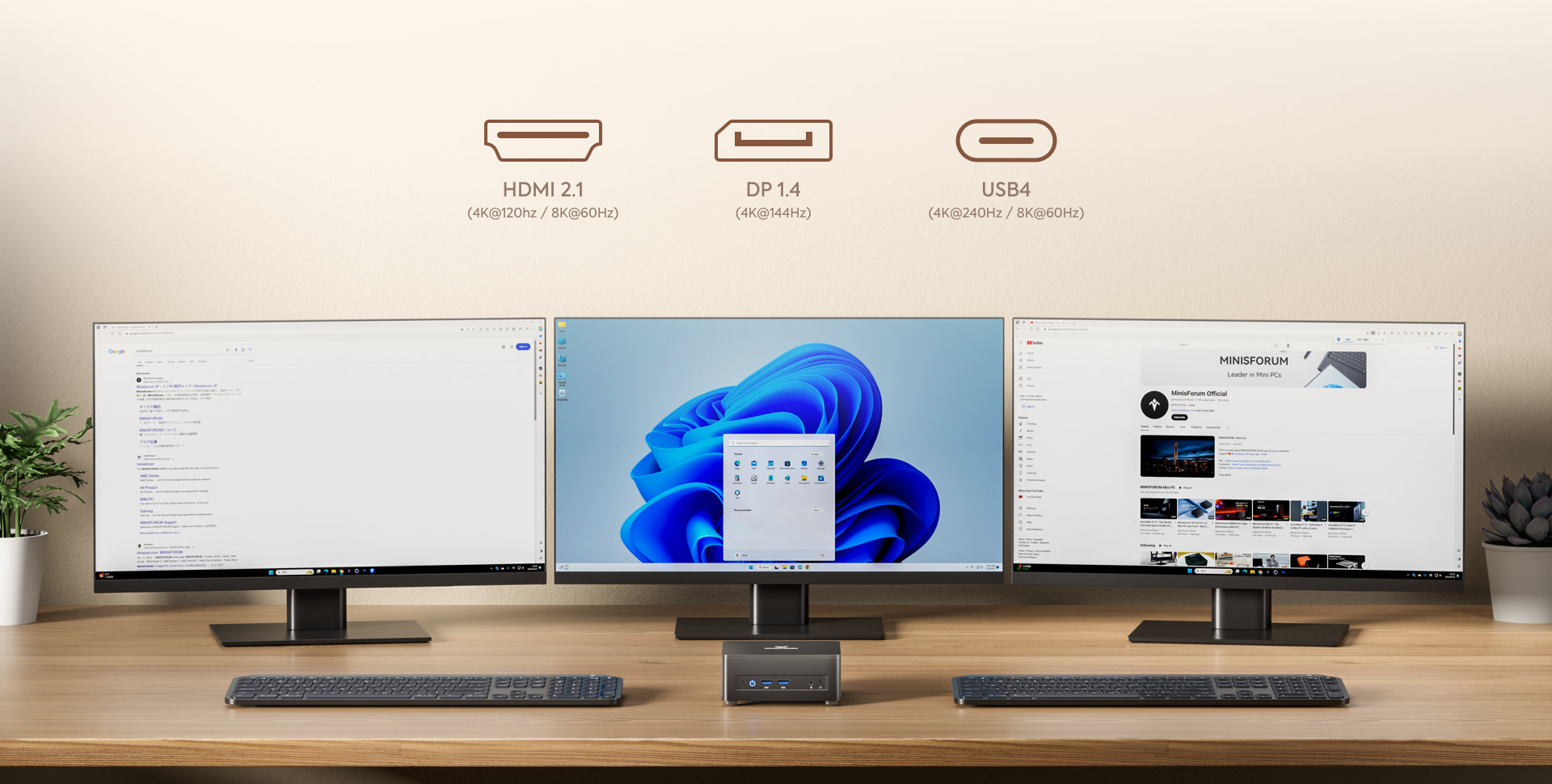 L'UM760 Slim permet un multitâche fluide grâce à ses ports USB4 haut débit, ses connexions HDMl 2.1 et DP 1.4. Connectez sans effort jusqu'à trois écrans 4K pour dynamiser votre flux de travail et augmenter votre efficacité.