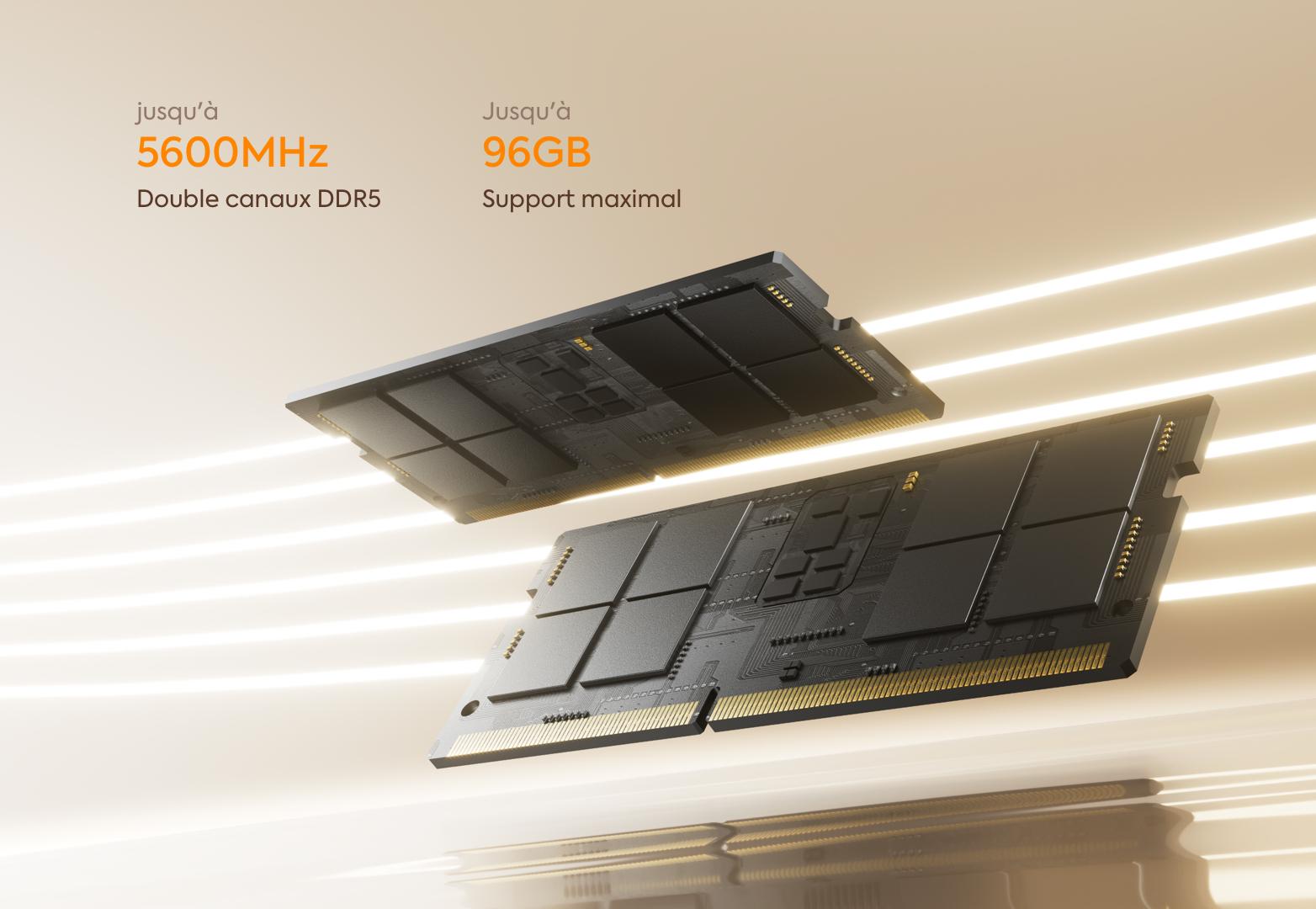 DDR5 double canal (emplacements SODIMM × 2, jusqu'à 5 600 MHz, max 96 Go)