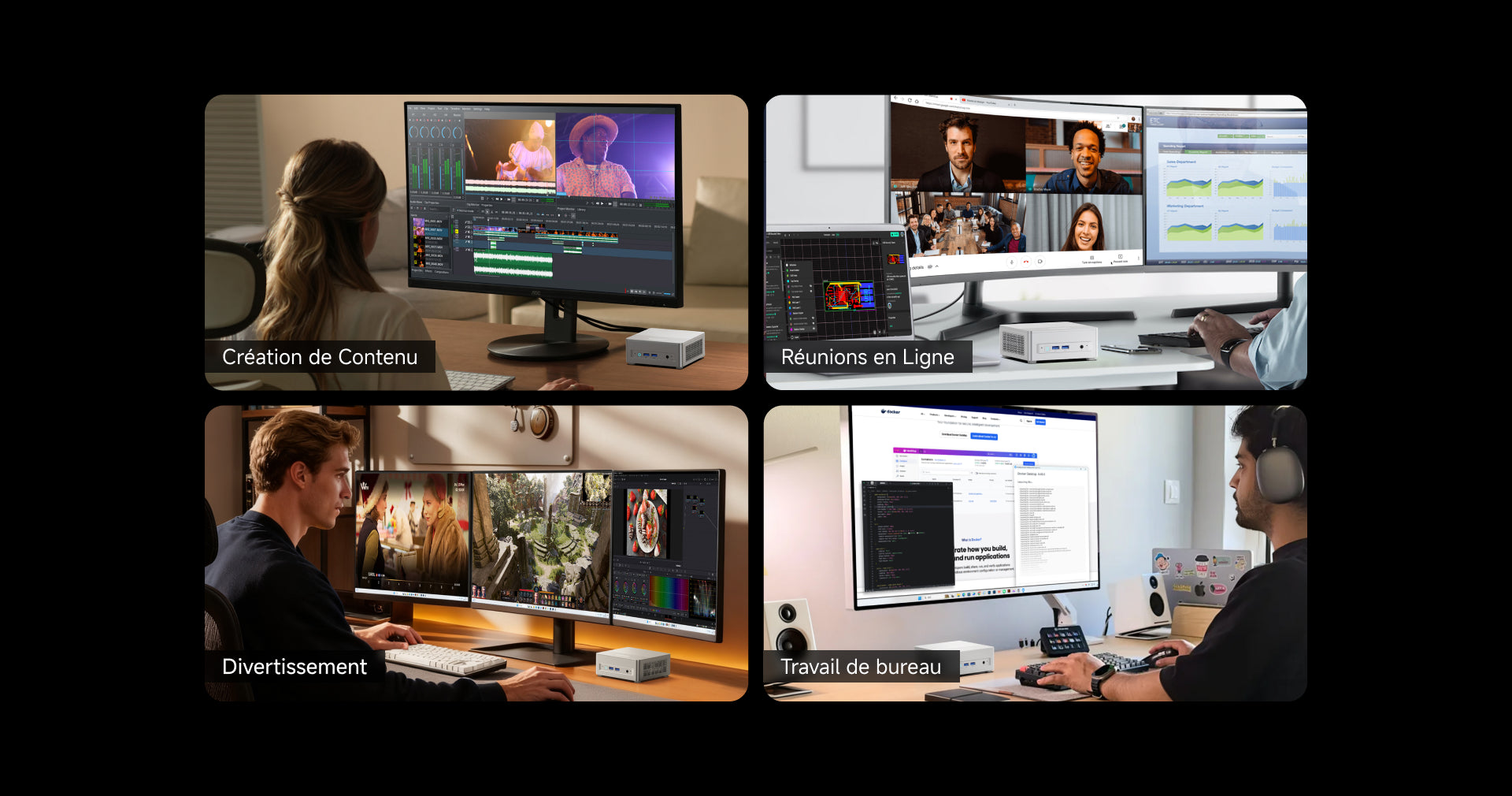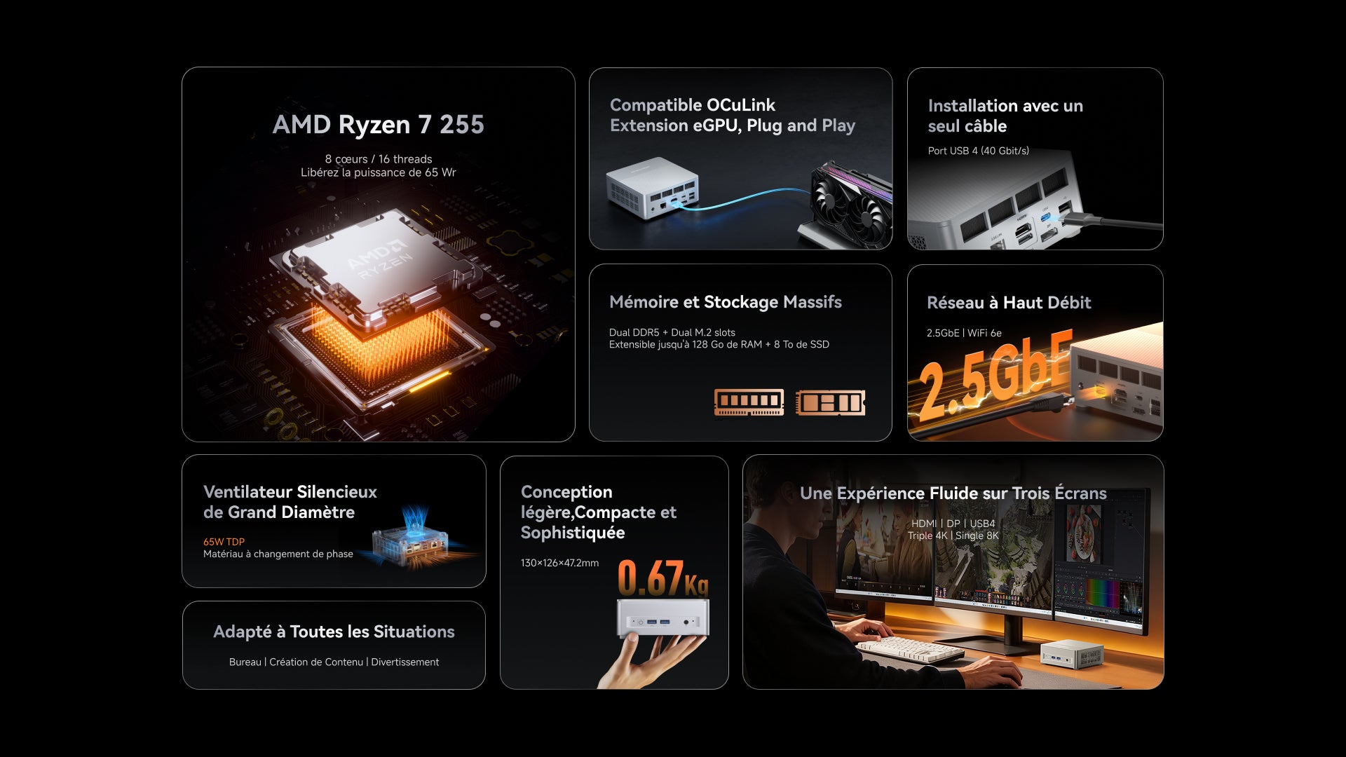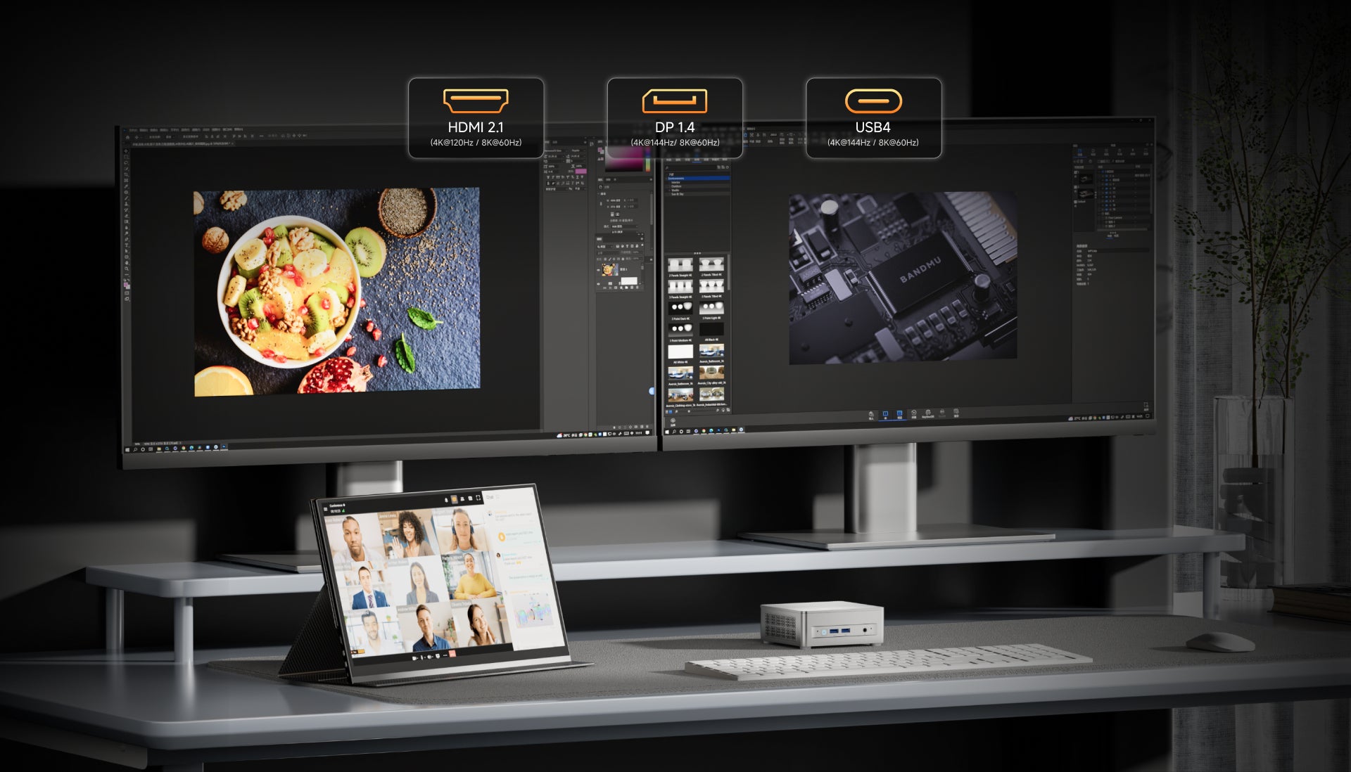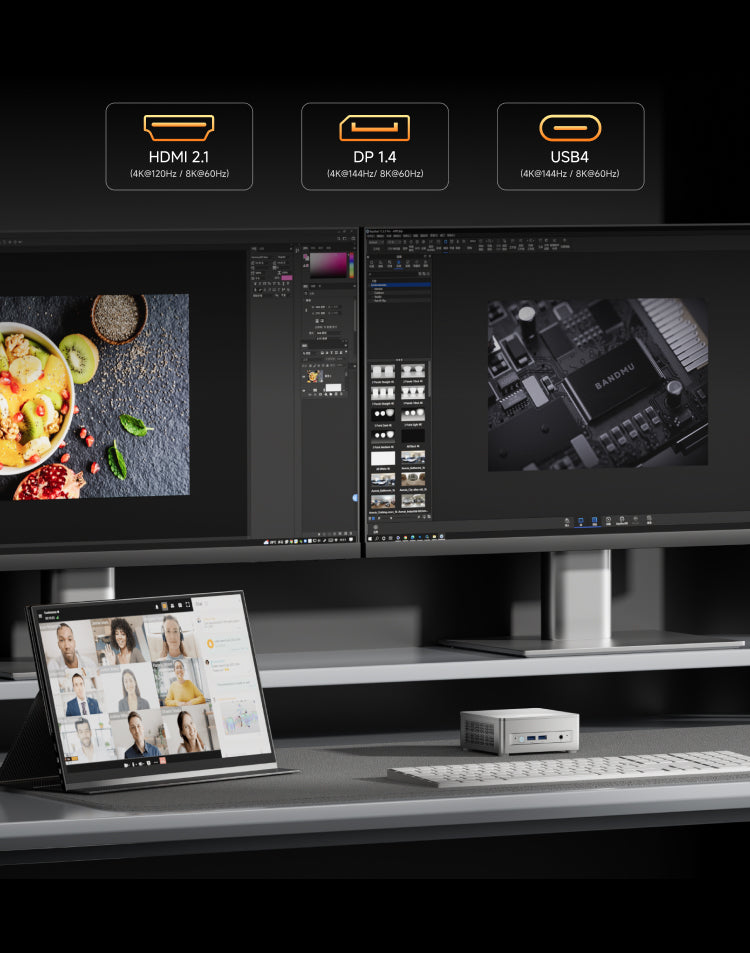 Prend en charge jusqu'à trois écrans pour un multitâche fluide et un divertissement immersif, un seul écran jusqu'à 8K, trois écrans jusqu'à 4K.